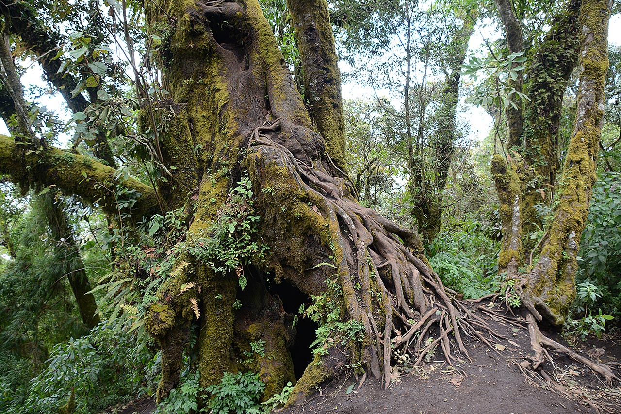 Het bos gaat over in nevelwoud. De hemel was tot nu bewolkt, maar langzamerhand komt er meer