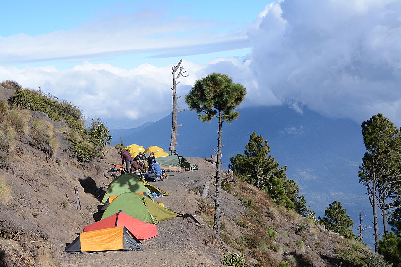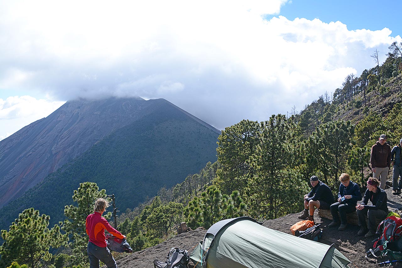 Vanaf de Acatenango vulkaan heb je normaal gesproken een mooi uitzicht op de Fuego vulkaan (4 km verder).