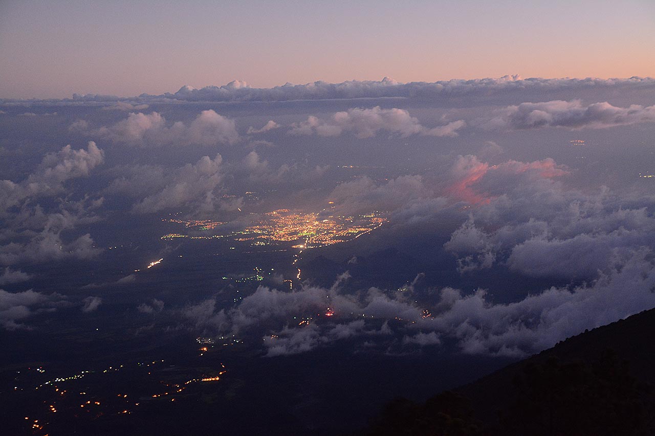 De wolken worden minder als het donker wordt, maar de Feugo is nog steeds voor ons verborgen.